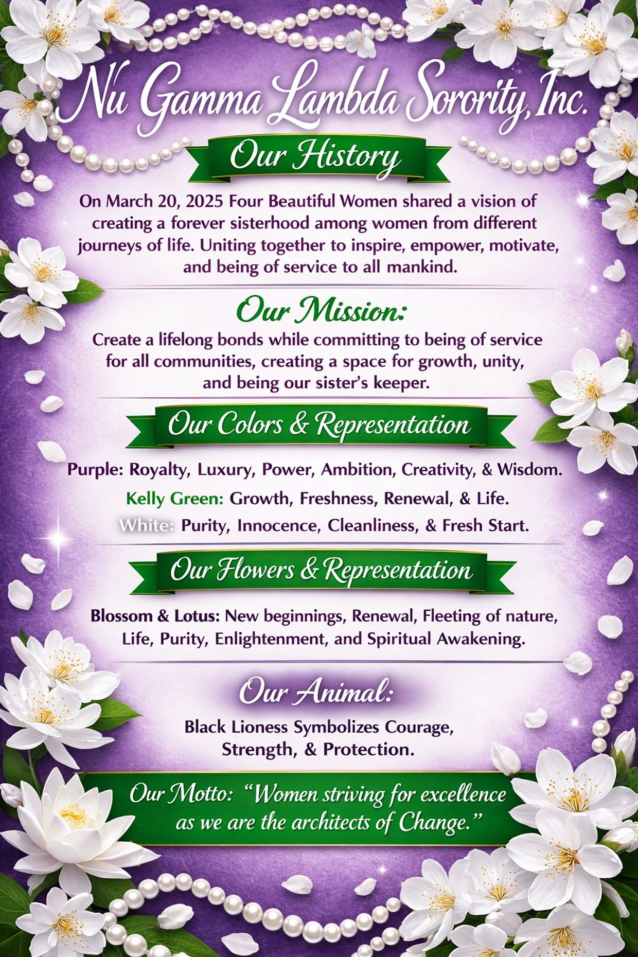 We look forward to welcoming you to Nu Gamma Lambda Sorority and embarking on this empowering journey together!